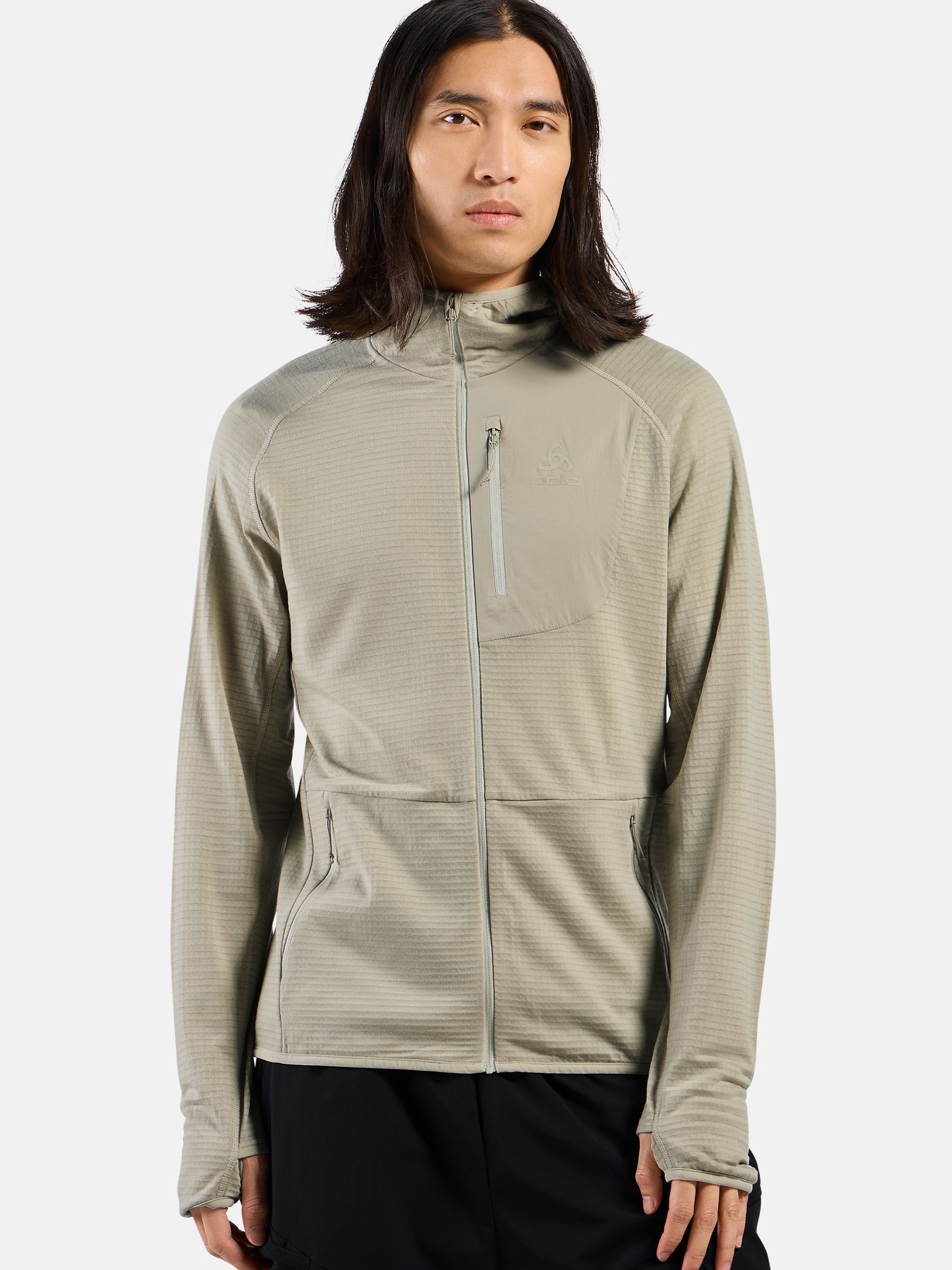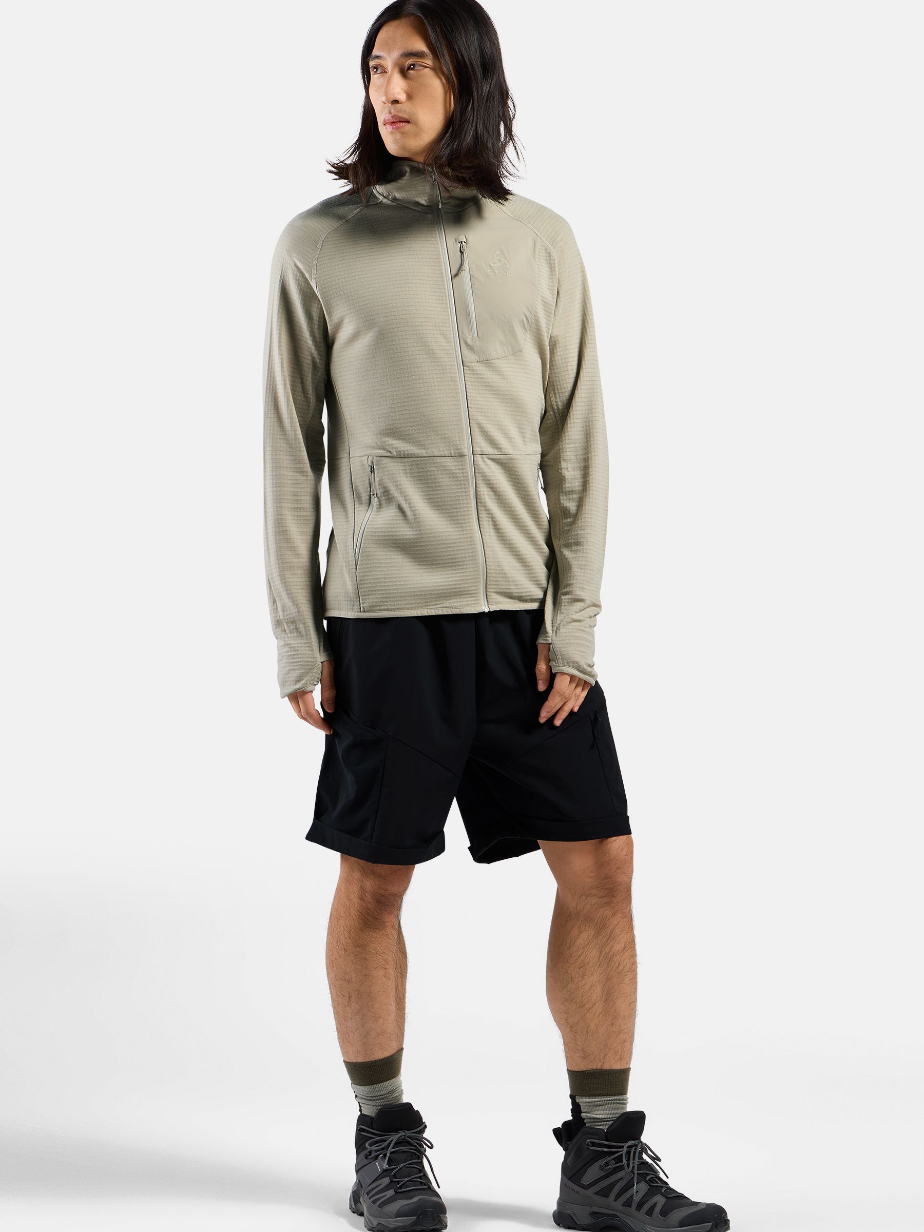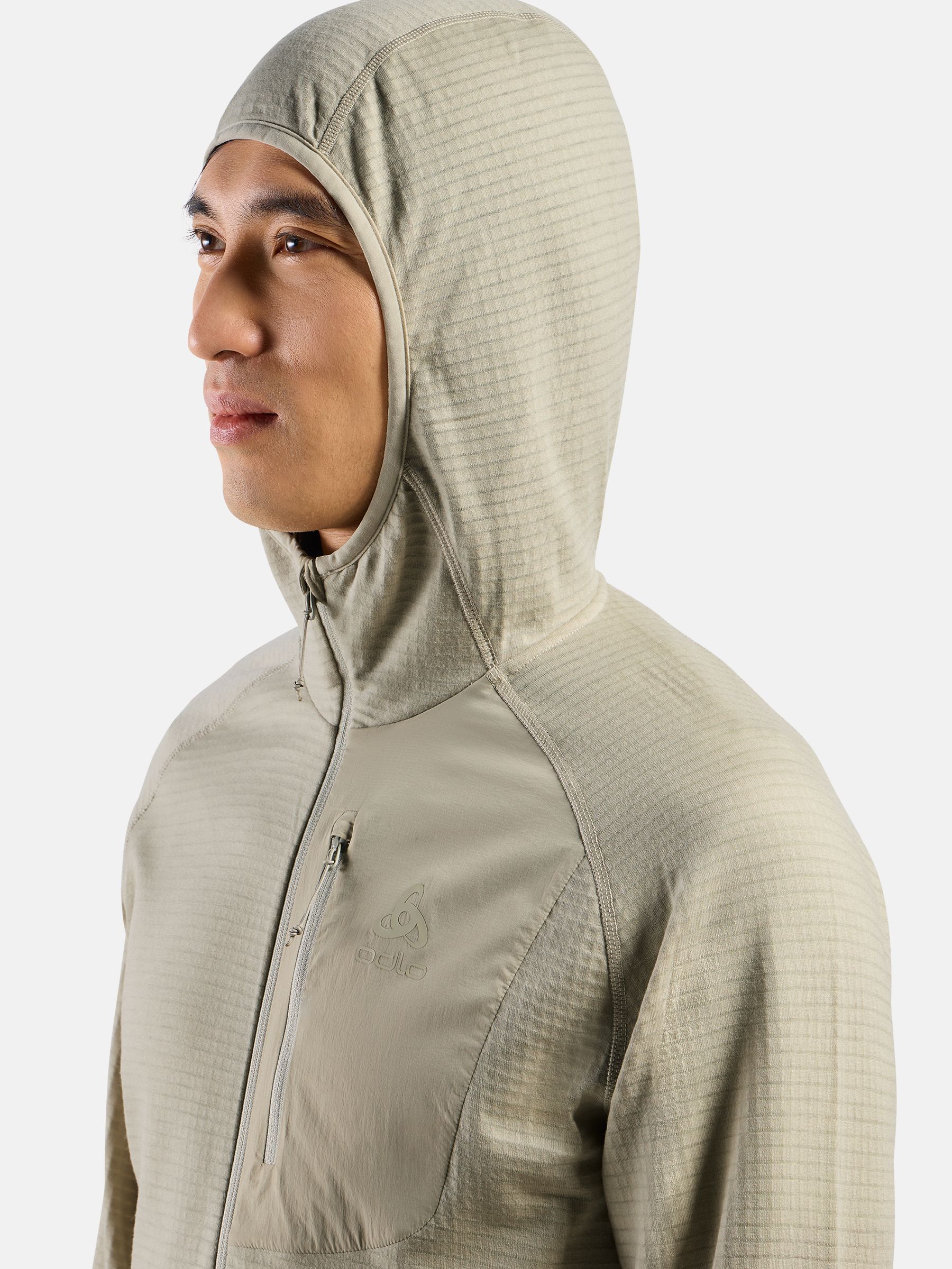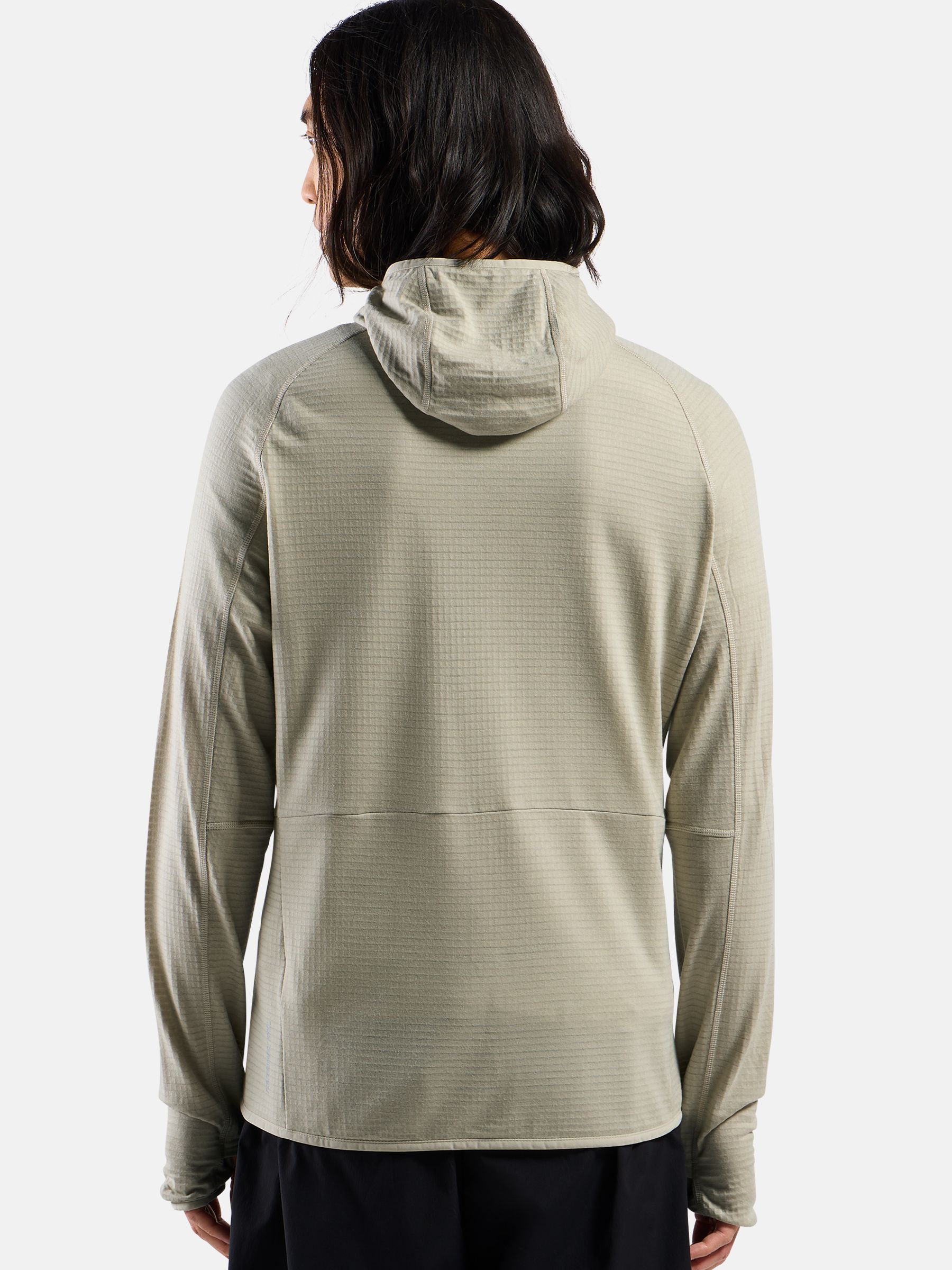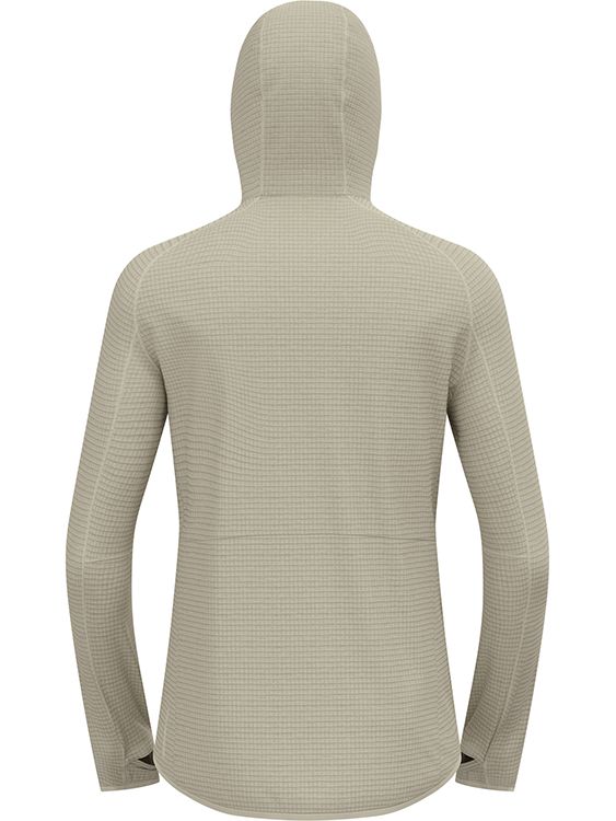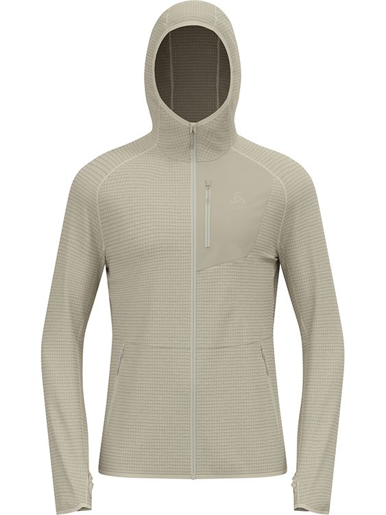메리노 울과 업사이클링 폴리에스터를 혼합한 그리드 스트레치 플리스 소재로 제작된 Ascent 미드 레이어 후드 집업은