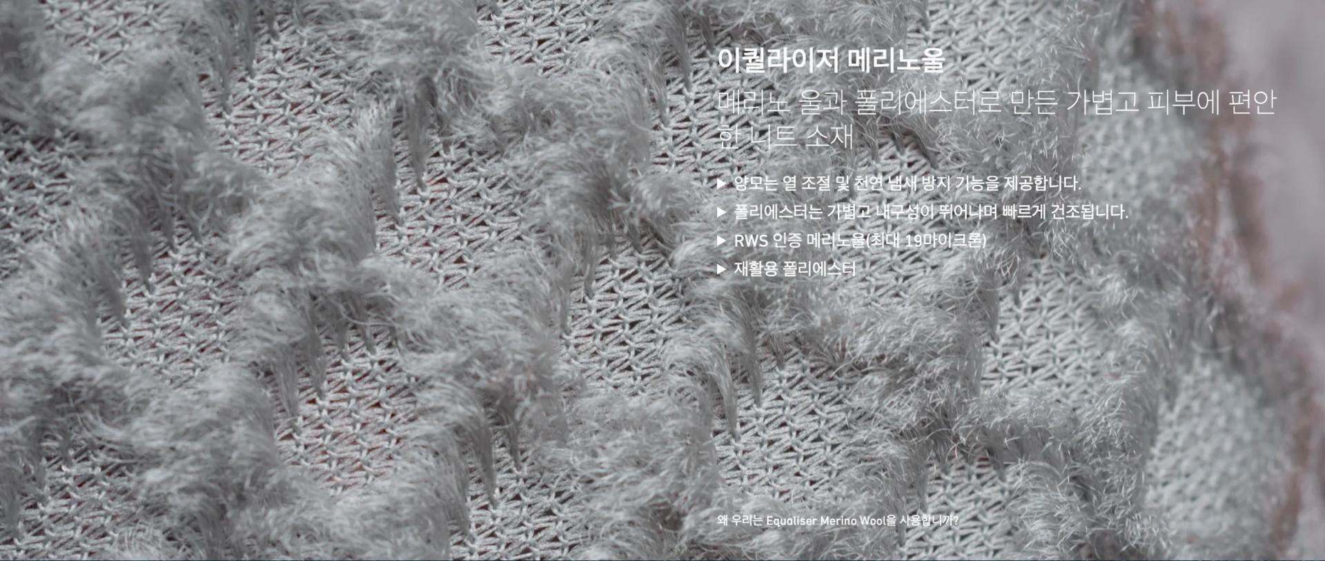 가벼운 무게(135g/m2)의 원단은 메리노 울 47%, 재활용 폴리에스터 53%로 만들어졌으며, 두 가지 소재의 장점을 모두 갖추고 있어 뛰어난 촉감을 선사합니다.