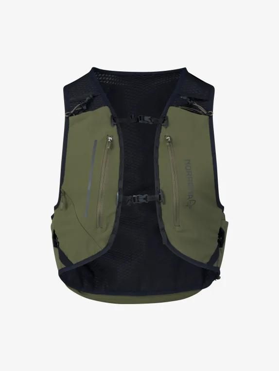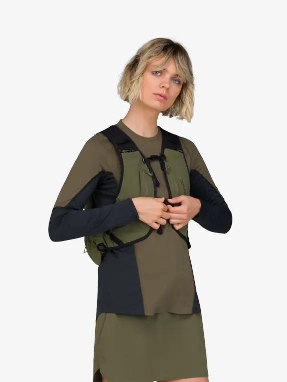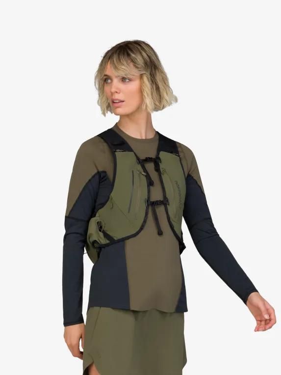 메인 원단은 가벼운 70D 립스탑 ECONYL®(95g/m2) 소재에 2000mm 방수 기능을 갖춘 PU 코팅이 되어 있습니다. 이퀄라이저 스트레치는 175g/m2 79% 업사이클링 나일론, 21% 엘라스테인 원단입니다. 하네스는 100% 업사이클링 폴리에스테르 에어 메쉬(215g/m2)로 제작되어 피부에 닿는 부위에 습기가 차는 것을 방지합니다. 주요 특징: 부드러운 물통을 보관할 수 있는 신축성 있는 전면 포켓 2개, 메인 수납공간 내부에 물통을 넣을 수 있는 대형 포켓, 지퍼식 가슴 포켓 3개, 젤과 에너지 바를 쉽게 넣을 수 있는 측면 오픈 포켓, 사용하지 않을 때 폴을 보관할 수 있는 앞뒤 양쪽의 수납 기능 등이 있습니다. 배낭 바닥에 신축성 있는 대형 포켓이 있어 재킷을 넣을 수 있습니다. 측면의 지퍼를 통해 이동 중에도 메인 수납공간에 접근 가능. 압축을 위한 신축성 있는 코드. 퀵 릴리즈 스냅과 조임끈이 있는 조절 가능한 10mm 스트랩 2개로 핏 조절이 가능하며, 안전 플루트, 내부 포켓과 열쇠고리가 있습니다.