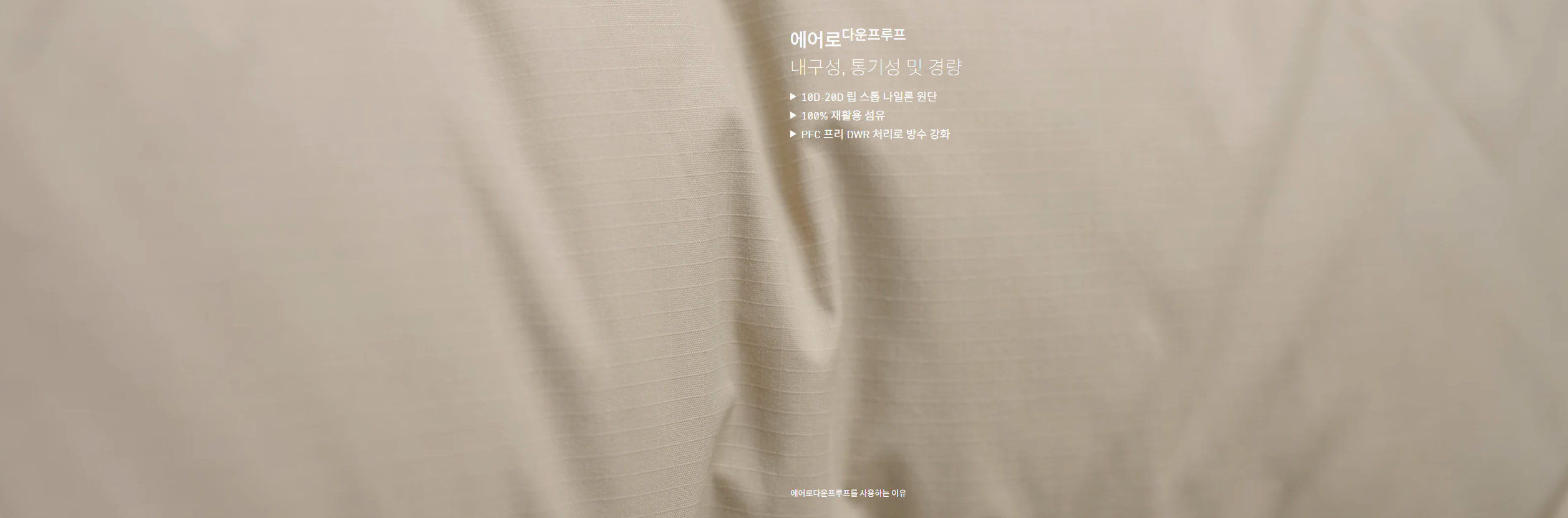 겉감은 aeroDownproof 원단을 사용하여 방풍 기능, 경량성, 부드러운 터치감, 그리고 내구성을 제공합니다.